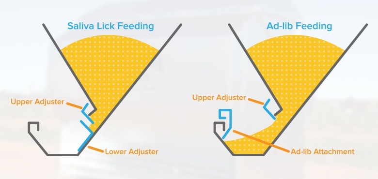 The lower adjuster is used to wipe the feed off the tongue of the animal. The closer it is set the more grain that will be removed from the tongue as it retracts from the feeder.